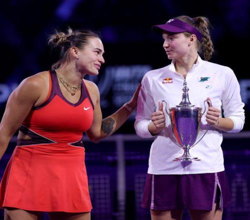 11月9日,利雅得WTA年终总决赛单打决赛,。合影环节,萨巴伦卡手捧奖杯与WTA首席执行官波西亚-阿彻合影时,莱巴金娜...
