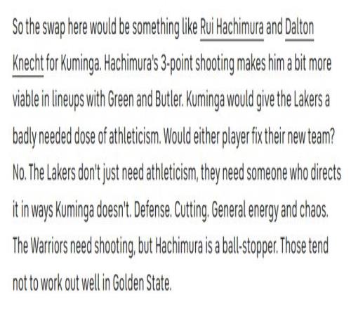 湖人不会放弃选秀权,也不会接手长期合同。如果他们要做交易动作,本质上不过是换汤不换药——用队内的到期合同去换取其他球队的到期合同,当然,最好是能补充球队现有阵容所欠缺的技术特点的球员。而库明加的合同下赛季为球队选项,实际上等同于一份到期合同。