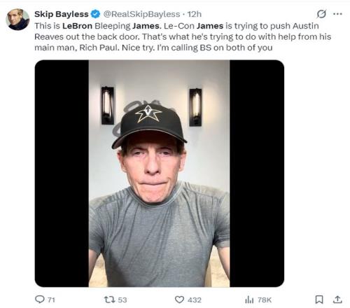 联盟‘金牌詹黑’斯利普-贝勒斯还在直播间诋毁詹姆斯,他说道:勒布朗正试图用后门把奥斯汀-里夫斯赶走,他利用他的经纪人里奇-保罗从中作梗,这就是勒布朗正在做的事,他两人的企图让我无法信任。(老詹是公开声援希望小里留下的,詹黑的诋毁太令人无奈)